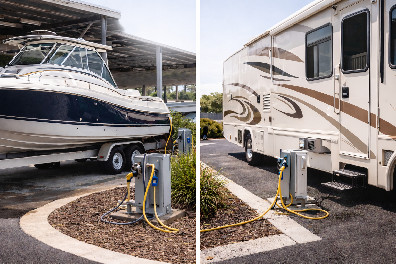Covered storage spaces include 30 amp electrical hookups, perfect for powering larger RVs and keeping your equipment ready to go.