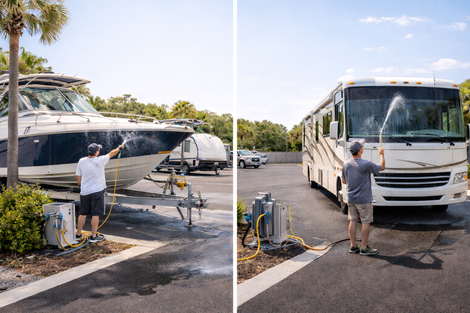 Every storage space includes convenient access to water, making it easy to rinse, clean, and maintain your boat or RV anytime.